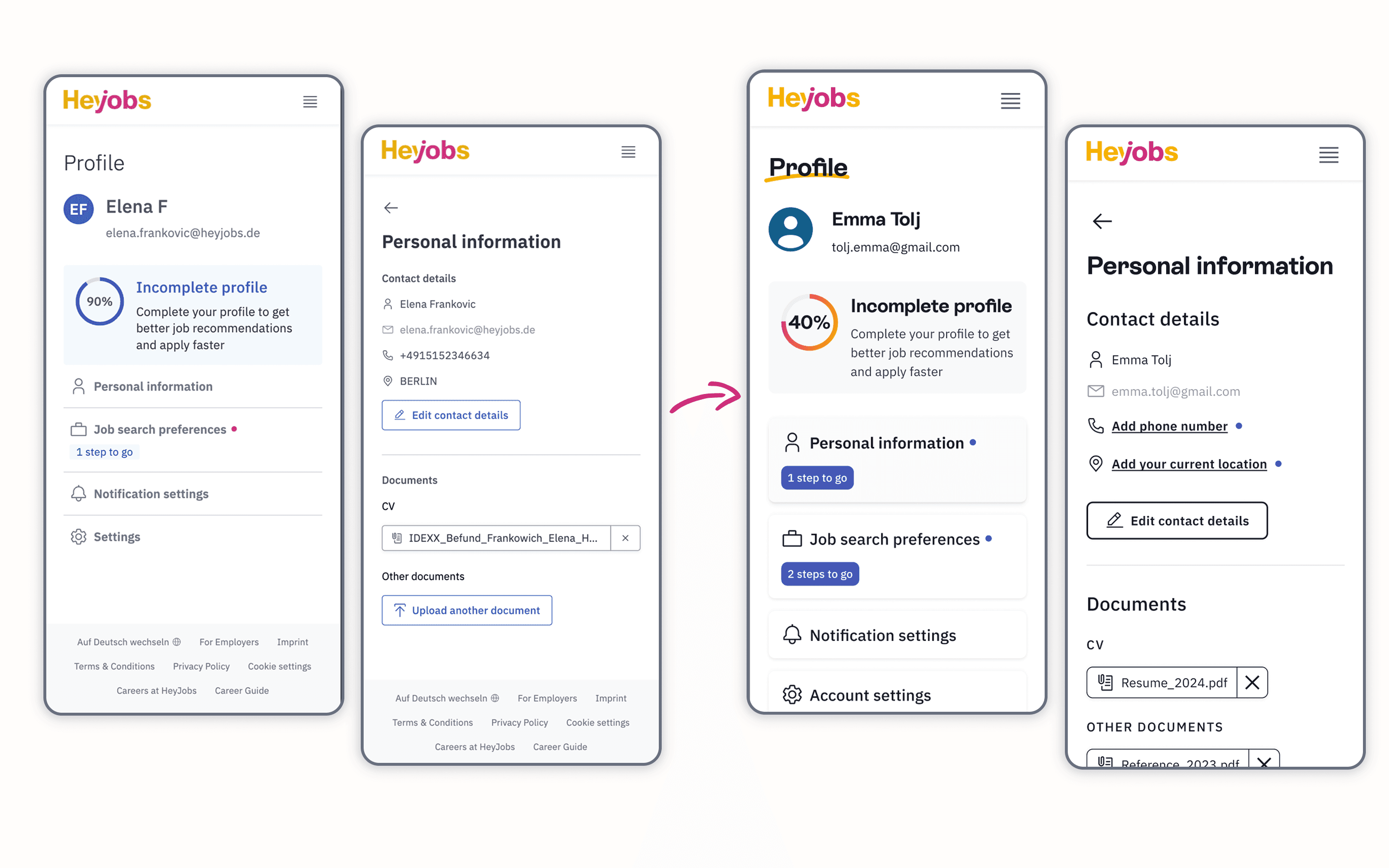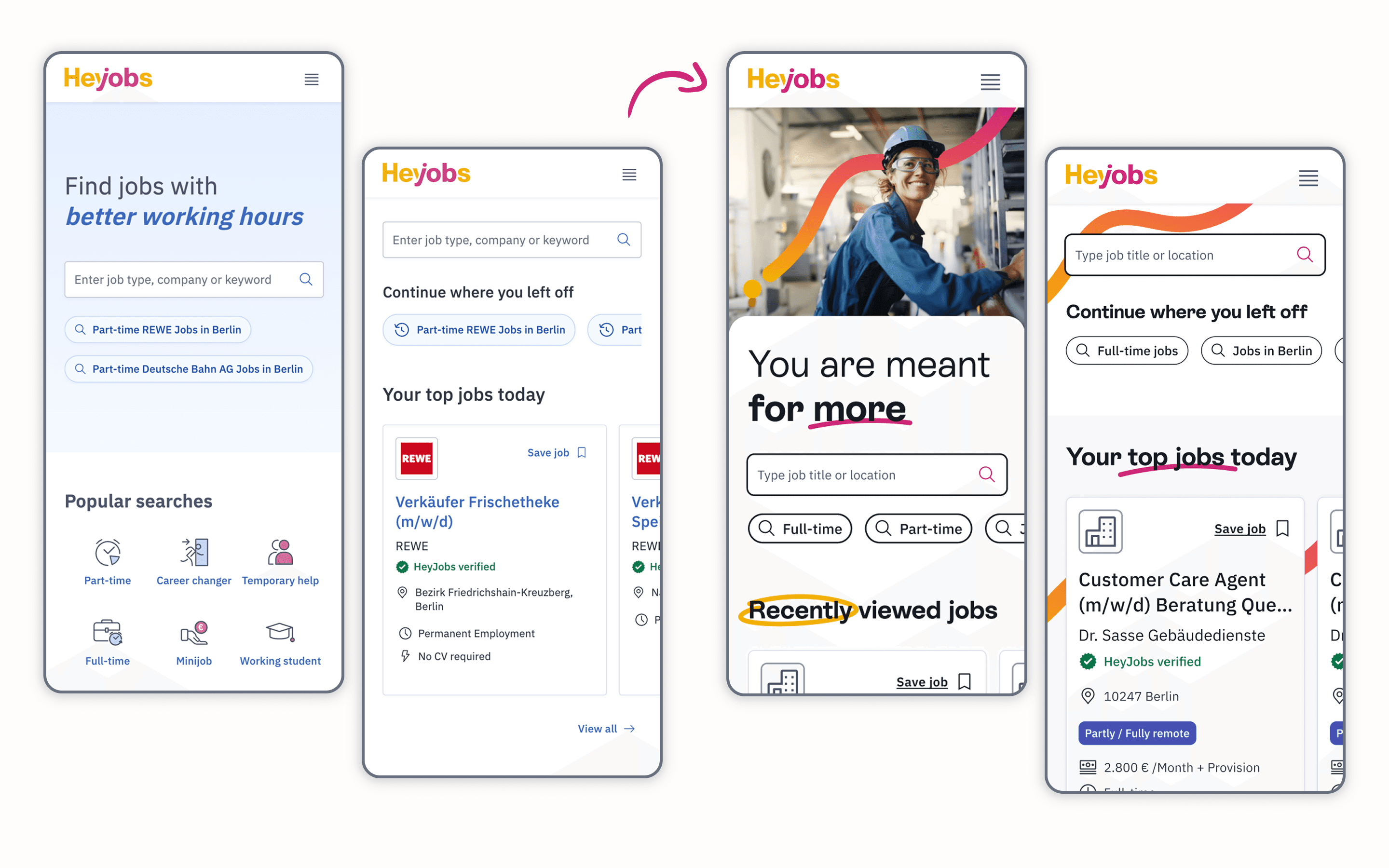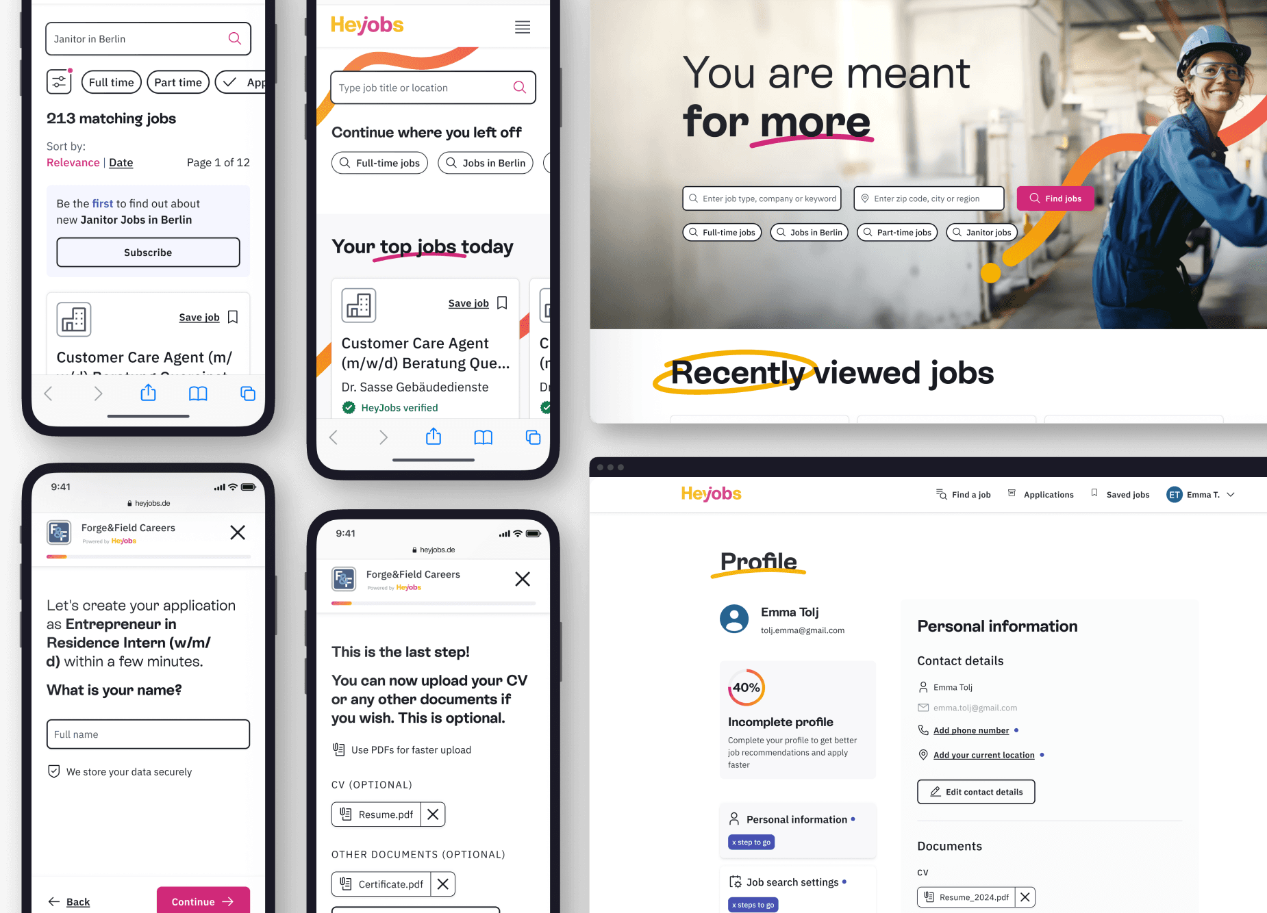 A graphic element - a continuous line - serves as a functional and visual signature throughout the product journey. This element connects design components, shapes iconography and navigates users through the HeyJobs experience, ensuring the interface is both memorable and recognisable.